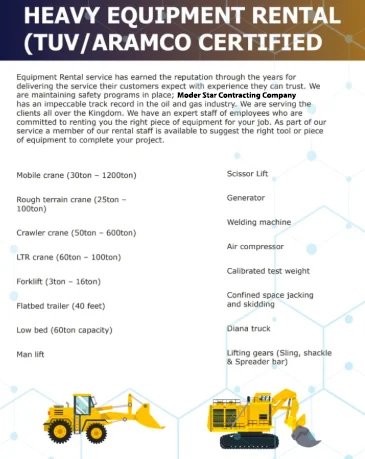 Moder Star Contracting Company Equipment rental division owned wide variety of returnable transit equipment can be mobilized to meet short or long term demands. We are preeminent in the field of supplying Heavy Equipments such as Cranes, Loaders, Excavators and Fork Lifts etc. renting in a full line of quality, well-maintained construction equipment and machinery.